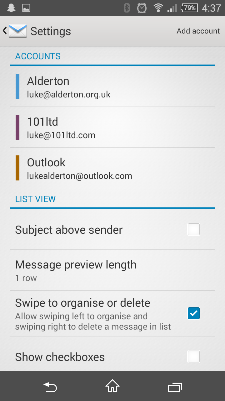 Once within the Settings view, you should see a list of accounts currently set up on the device, the accounts (if any) can all be managed from this screen.There should also be a button to the top right of the screen that says Add account, tapping this button will open a new view that will allow you to start setting up your new email account.