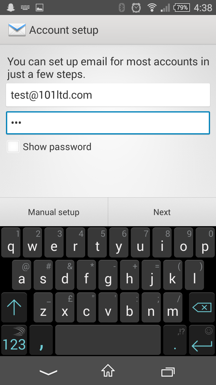 Now you will be prompted to input your account username and password, this will tell the email application where to load the mail from.Please input your account username and password as shown on the image to the right, you can tap the Show password checkbox at any time to so that you can make sure your password is correct before continuing. Once you've confirmed your details are correct, Manual setup, this will take you to the next step.