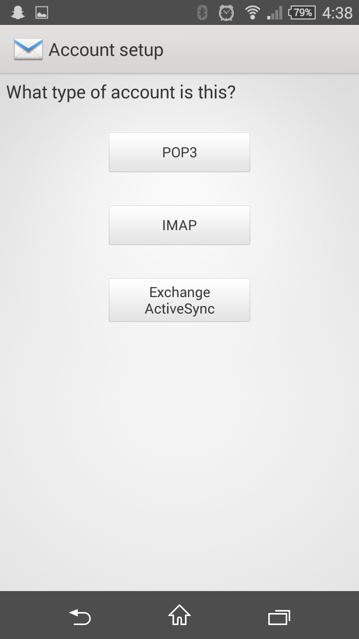 This view is a simple one, choose the account type you have. If you are unsure what account type you have, please speak to the person that set up your email account.In general, a POP3 account will allow you to view your mail on one device, an IMAP account will allow you to view your mail on many devices and an Exchange ActiveSync works like IMAP but gives you extras such as the ability to sync your calendar accross multiple devices.