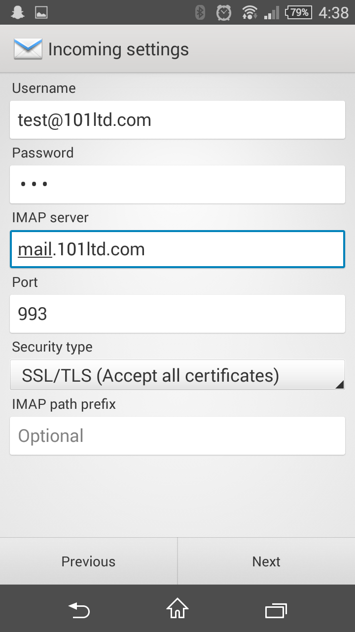 Please change IMAP/POP3 server to mail.101ltd.com and change security type to SSL/TLS (Accept all certificates) or SSL (Accept all certificates) depending on the options available. You might have noticed that the Port number has now changed and should read 993 if you're using IMAP or 995 if you're using POP3.