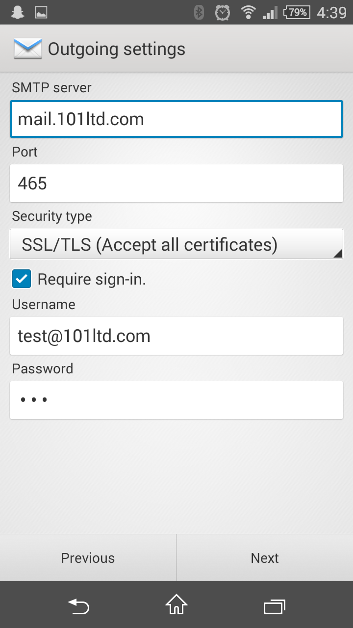 This step allows you to set up what server your email application will send your email to.Please change SMTP server to mail.101ltd.com and change security type to SSL/TLS (Accept all certificates) or SSL (Accept all certificates) depending on the options available. You might have noticed that the Port number has now changed and should read 465.