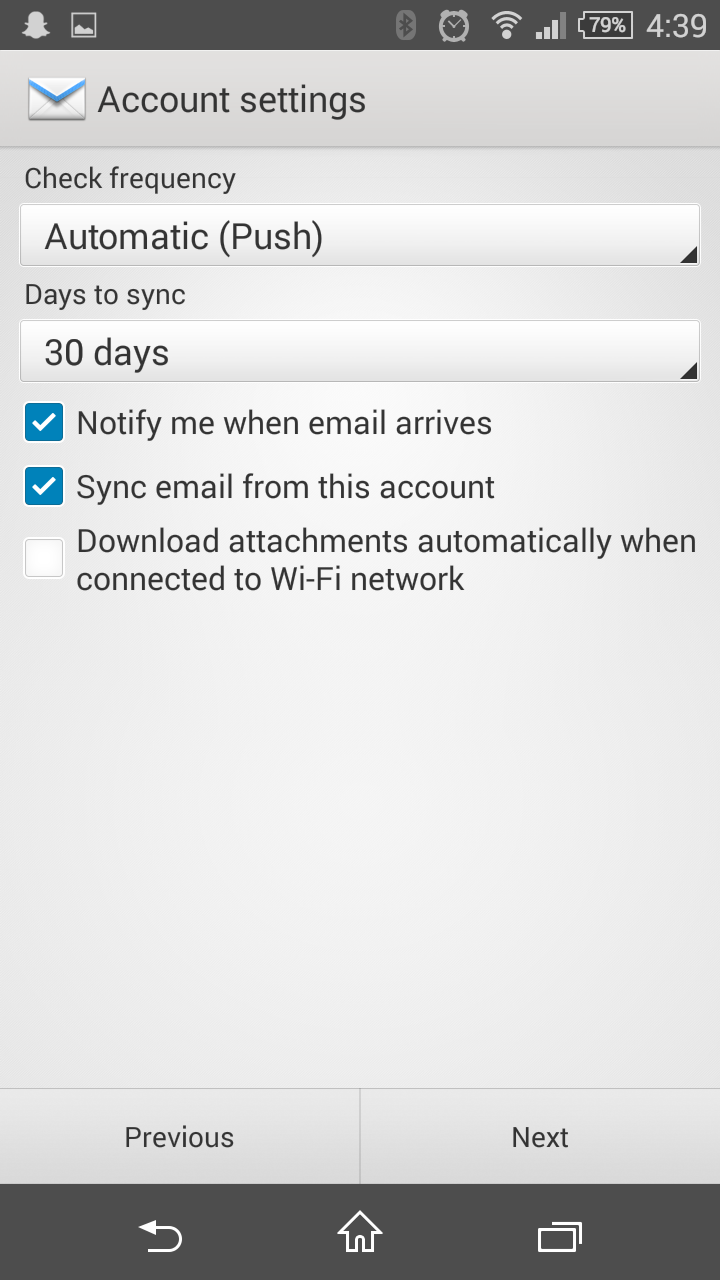You will now be asked to decide how often you want your email to sync, in most cases, the default options are good enough.For Check frequency, the default setting, Automatic (Push) will make sure that you see the email has arrived as soon as the server receives it.