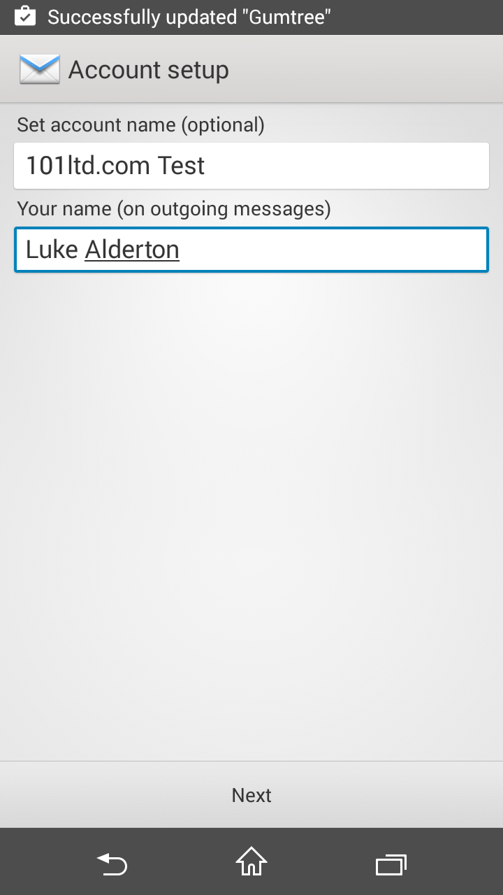 You need to name the account, in most cases I'd reccomend calling it whatever the domain for the account is, for example 101ltd. If you're setting up many accounts on the same domain, perhaps consider calling the account something like Sales 101ltd.Then simply input your full name in the Your name box and click next to view the mail in your account.